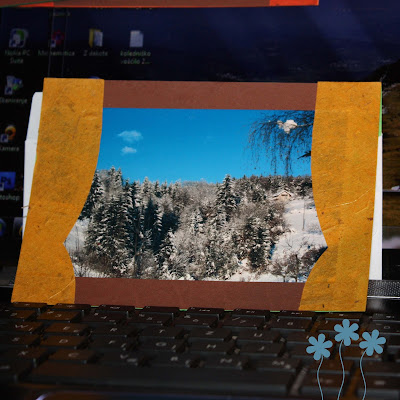 Odločila sem se, da vse skupaj izgleda kot pogled skozi okno, zato je nad in pod sliko viden "okenski okvir", levo in desno pa so prilepljene zavese iz recikliranega papirja. Recikliran papir mi je všeč, ker ni gladek, ampak ima raznorazne unikatne teksture. Nekateri so debelejši, nekateri so tanjši - že malo prozorni, tako da omogočajo pisano ustvarjanje.